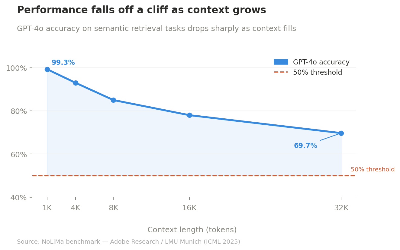 The NoLiMa benchmark from Adobe Research and LMU Munich (ICML 2025) made the collapse concrete. Evaluating models that advertise 128K+ token support on tasks requiring genuine semantic inference rather than keyword matching, they found that 10 of 12 models dropped below 50% of their short-context baseline by 32K tokens. GPT-4o fell from 99.3% to 69.7% at 32K. Even the top reasoning models, o1, o3-mini, and DeepSeek-R1, scored below 50% on the harder benchmark variant at that length. The Needle in a Haystack tests that models ace in marketing materials measure lexical retrieval. Real tasks don’t look like that.