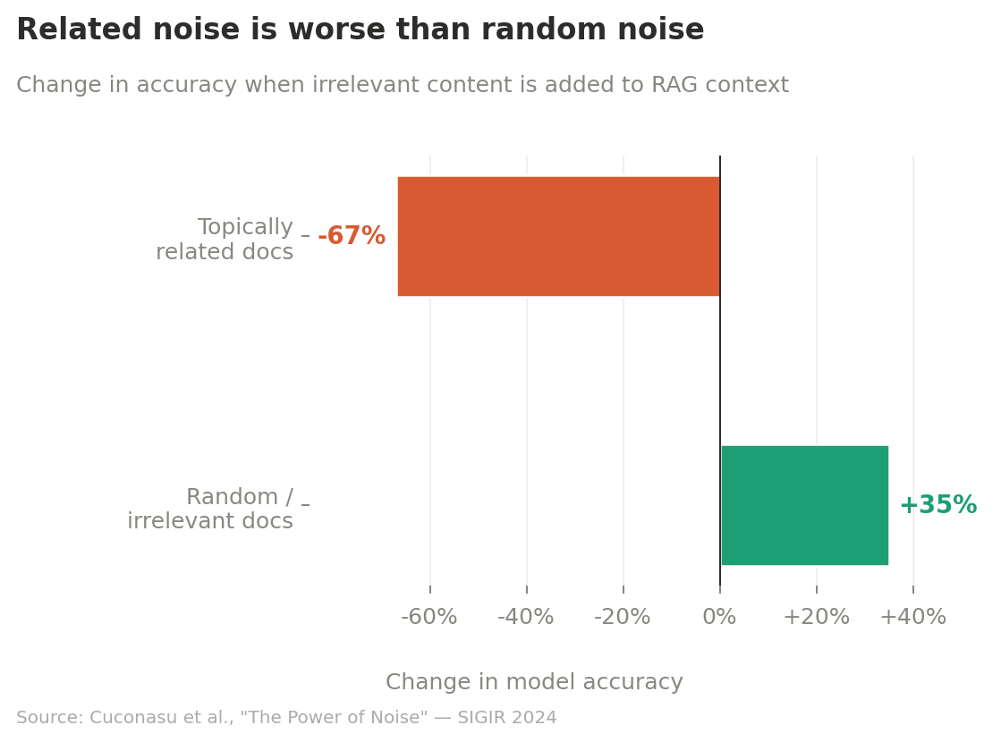 The most direct evidence comes from Cuconasu et al.’s “The Power of Noise” (SIGIR 2024). Adding related-but-not-answering documents caused accuracy degradation of up to 67%. Adding just one related distractor caused drops of up to 24 percentage points. The control condition with completely random, irrelevant documents improved accuracy by up to 35%. That’s roughly a 100-percentage-point swing between the effects of topically related noise versus random noise. The documents that look most relevant to the question but don’t answer it are the most dangerous things you can put in a context window.