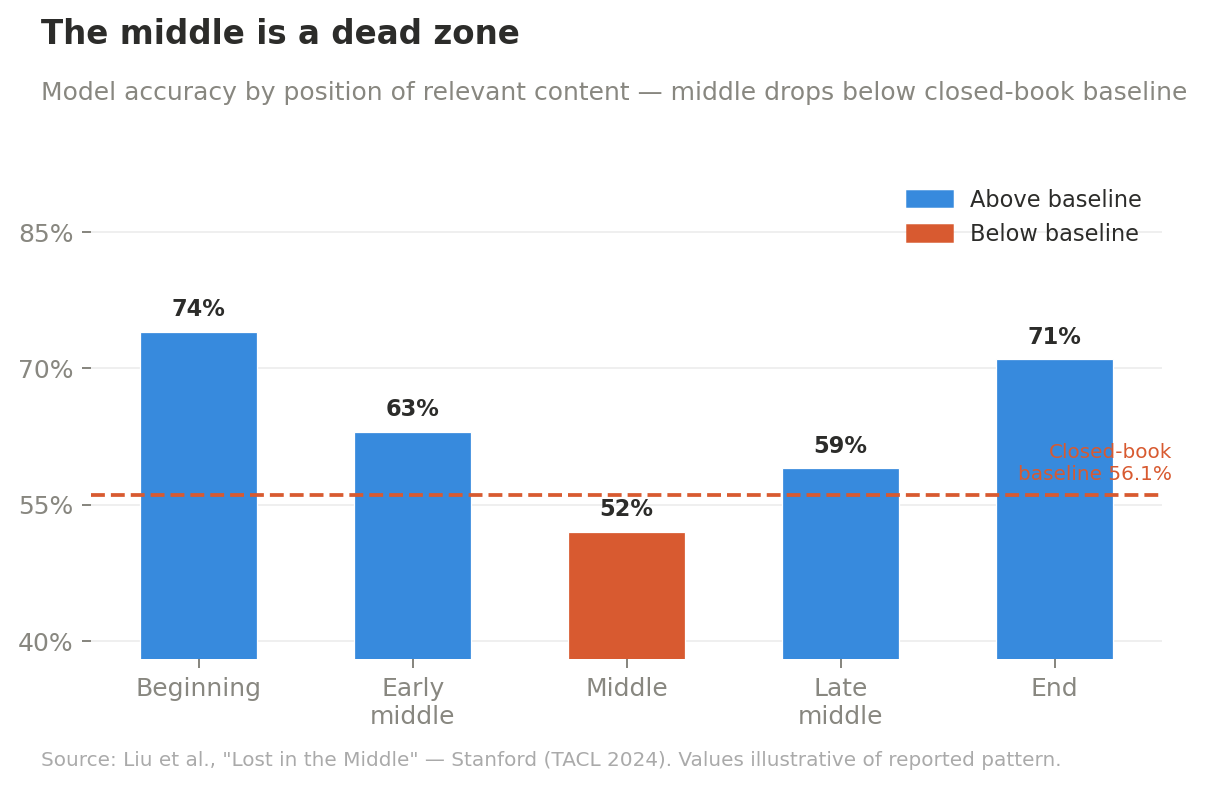 The original Stanford result is striking on its own: in 20- and 30-document settings, GPT-3.5-Turbo’s accuracy dropped by more than 20 percentage points when the relevant passage was buried in the middle, falling below its 56.1% closed-book baseline. The model performed better relying purely on its training data than when it was given the right answer in the wrong position. More context, worse result.