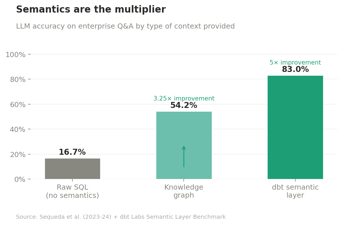 The contrast with a properly built semantic layer makes the gap concrete. Sequeda et al. tested GPT-4 on enterprise question answering two ways: direct SQL prompting versus a Knowledge Graph representation with ontology and semantic structure. Zero-shot SQL prompting achieved 16.7% accuracy. The Knowledge Graph representation achieved 54.2%, a 3.25x improvement. For complex, high-schema questions, the SQL-only approach scored 0%; the KG approach scored 35%. dbt Labs replicated this using their semantic layer with GPT-4: 83% accuracy versus the 16.7% raw SQL baseline, a 5x improvement. Adding natural language column descriptions moved several question categories from 0% to 100% success.